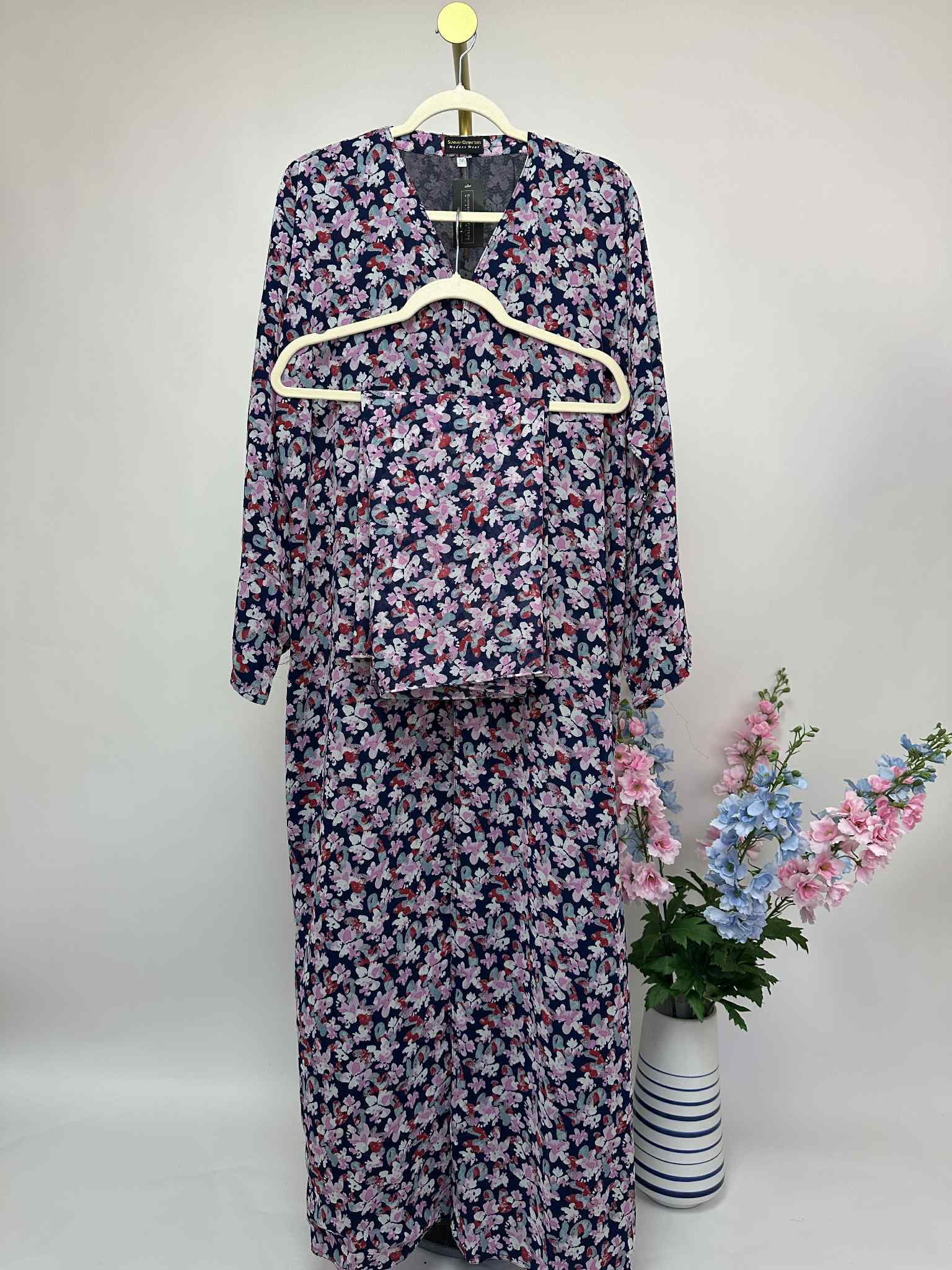 Floral print open abaya with matching print hijab. 2 buttons closure. Comes with unattached belt