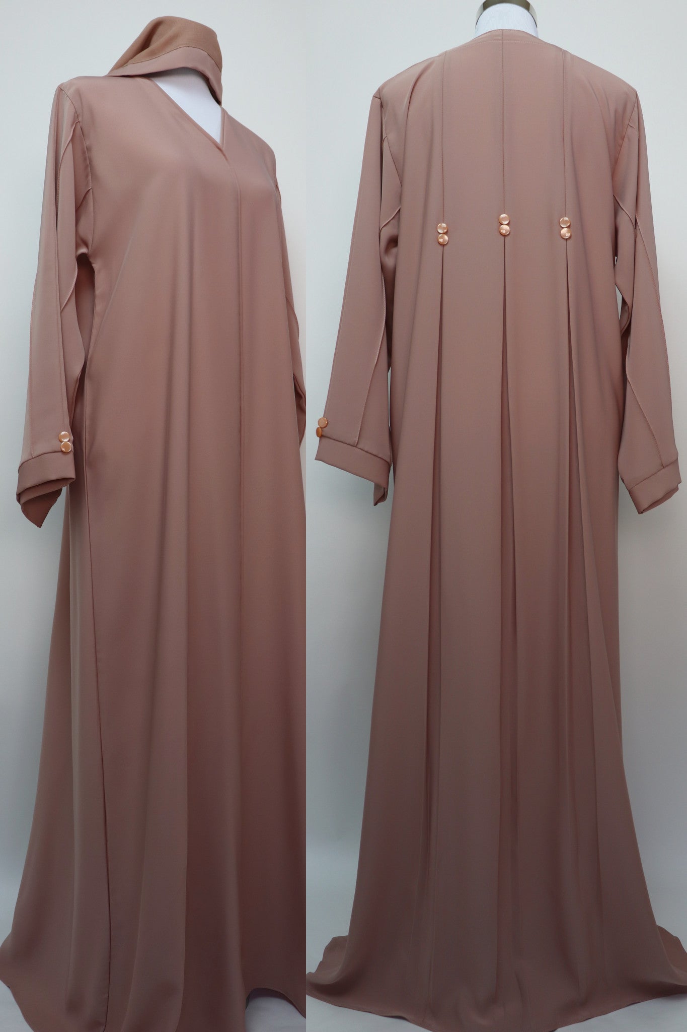 Minimalist yet elegant abaya, featuring three slits at the back and buttons accent detail. Made with luxurious Korean nida fabric. Comes with hijab.