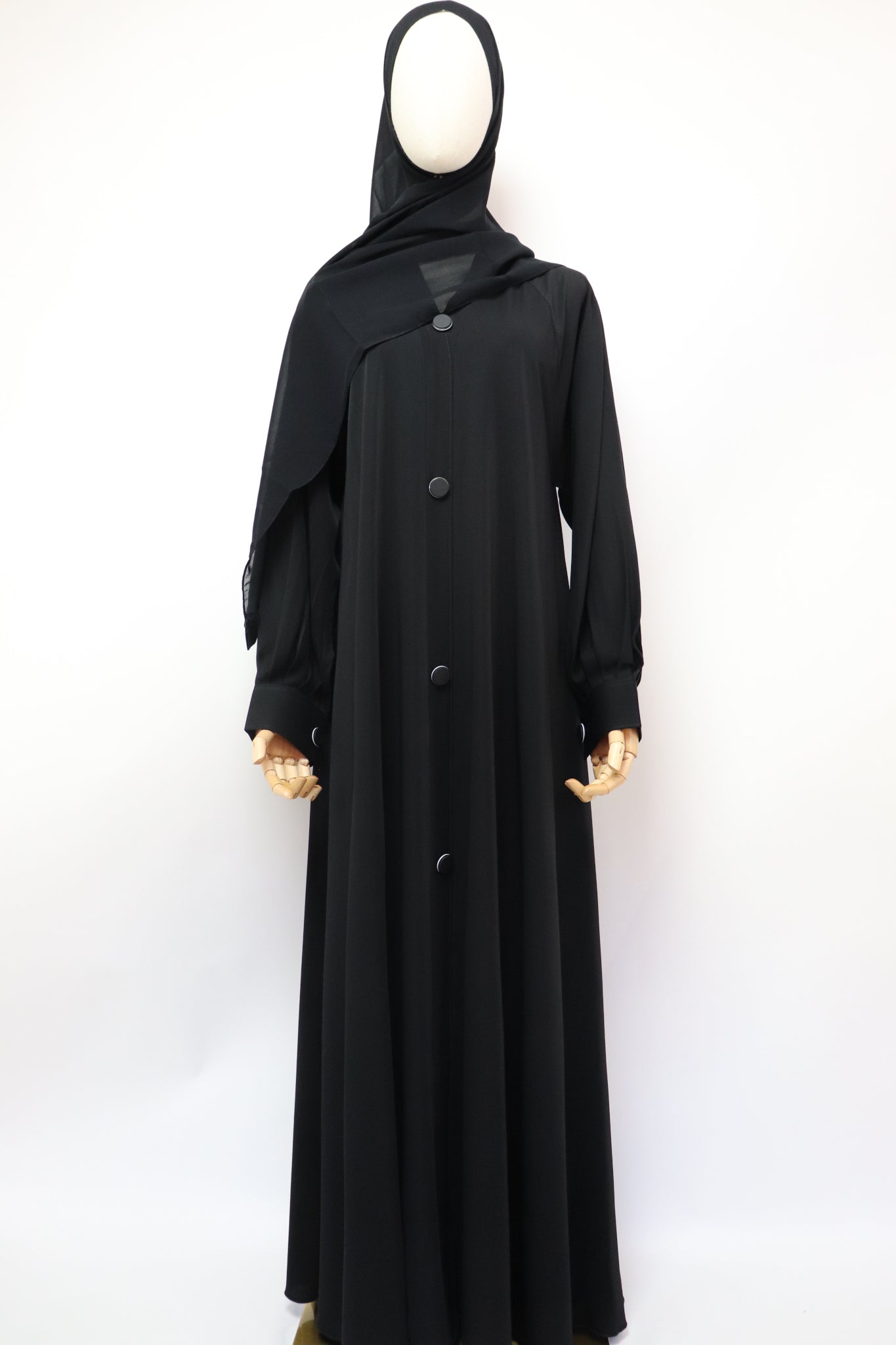 Closed flare umbrella abaya with brown buttons accent detail. Comes with hijab.