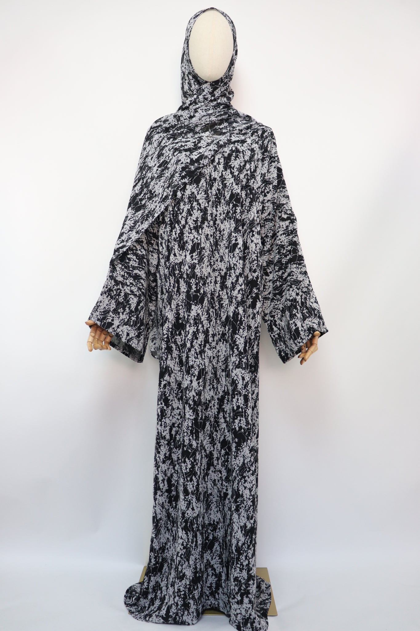 Floral print open abaya with matching print hijab. 2 buttons closure. Comes with unattached belt