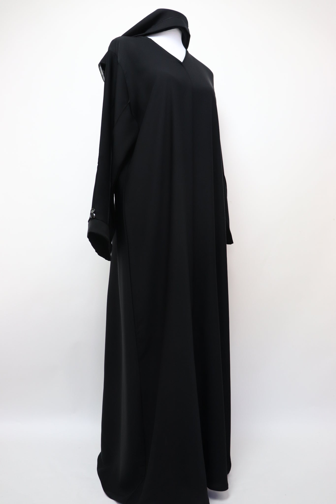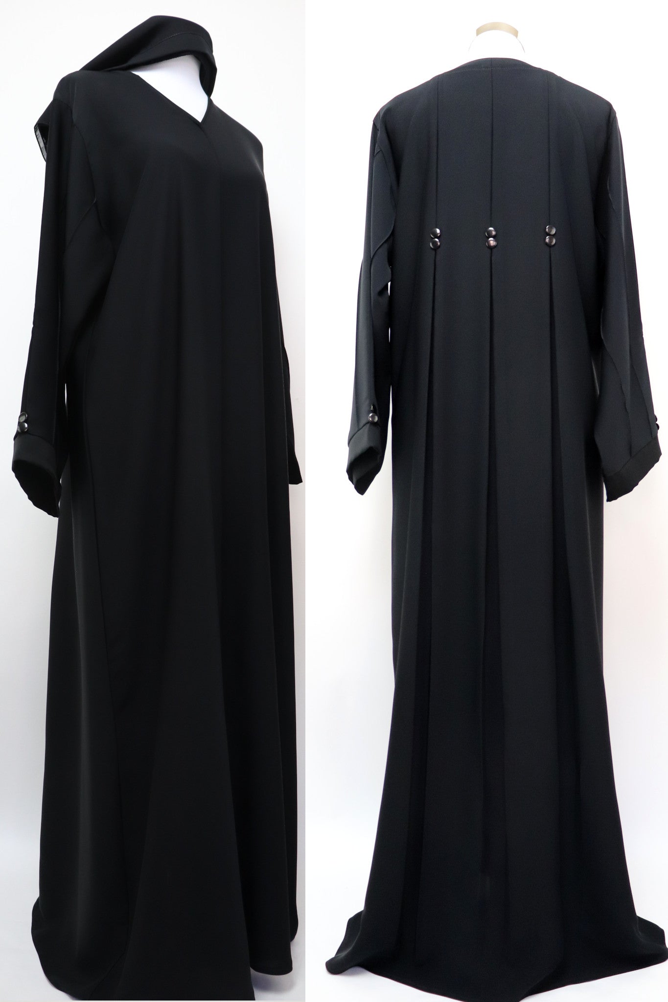 Minimalist yet elegant abaya, featuring three slits at the back and buttons accent detail. Made with luxurious Korean nida fabric. Comes with hijab.