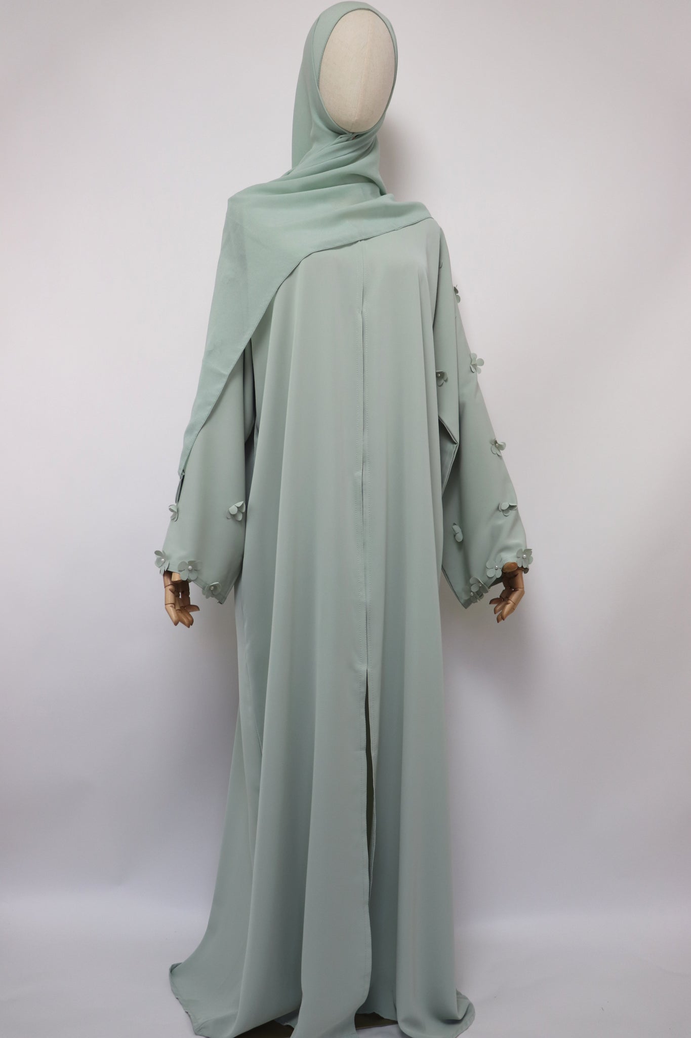 Open standard cut abaya with daisy patches and pearls on the sleeves. Comes with hijab.