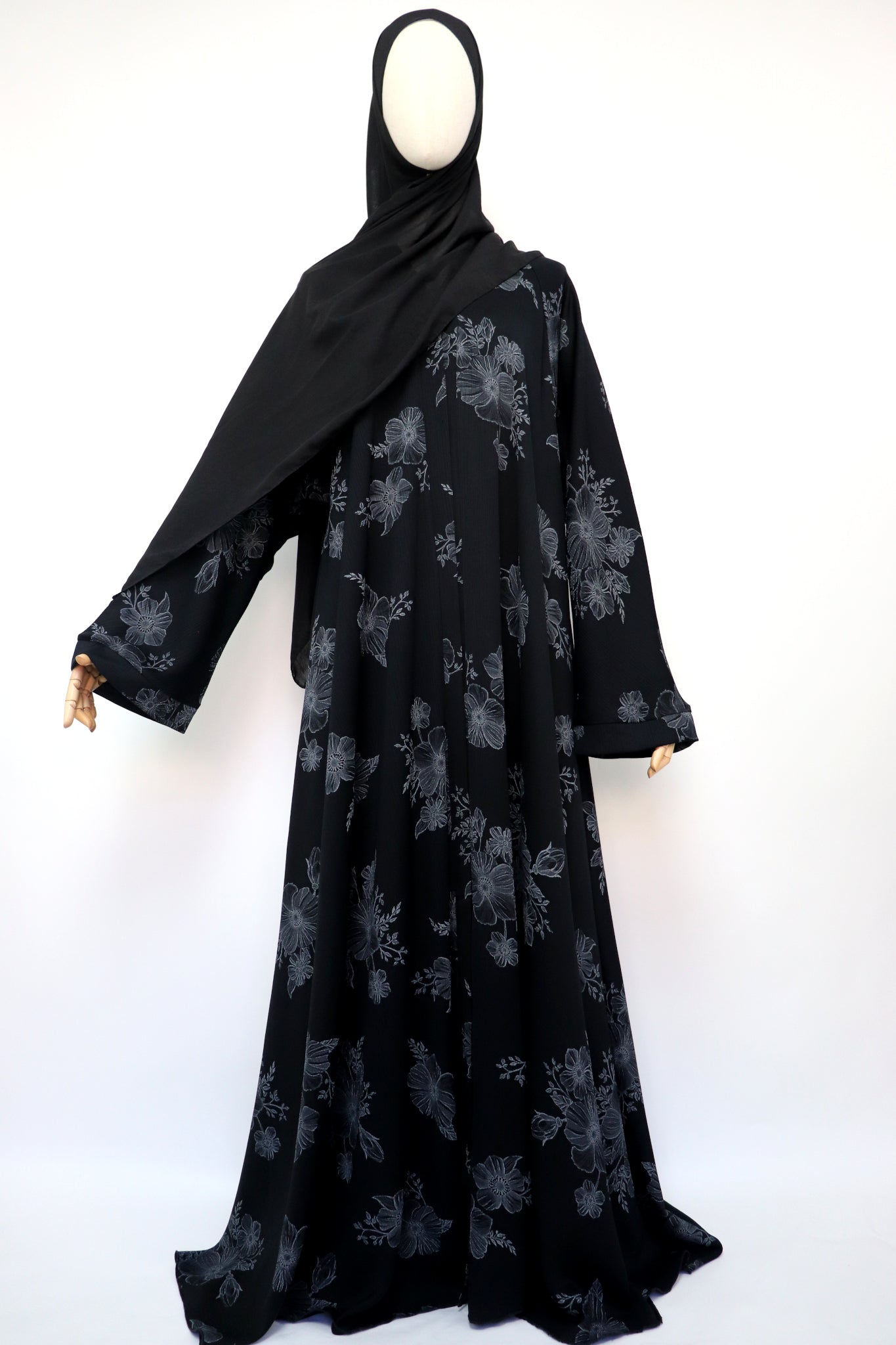 Open Flare Floral Print Crinkle Umbrella Abaya - Black Gray