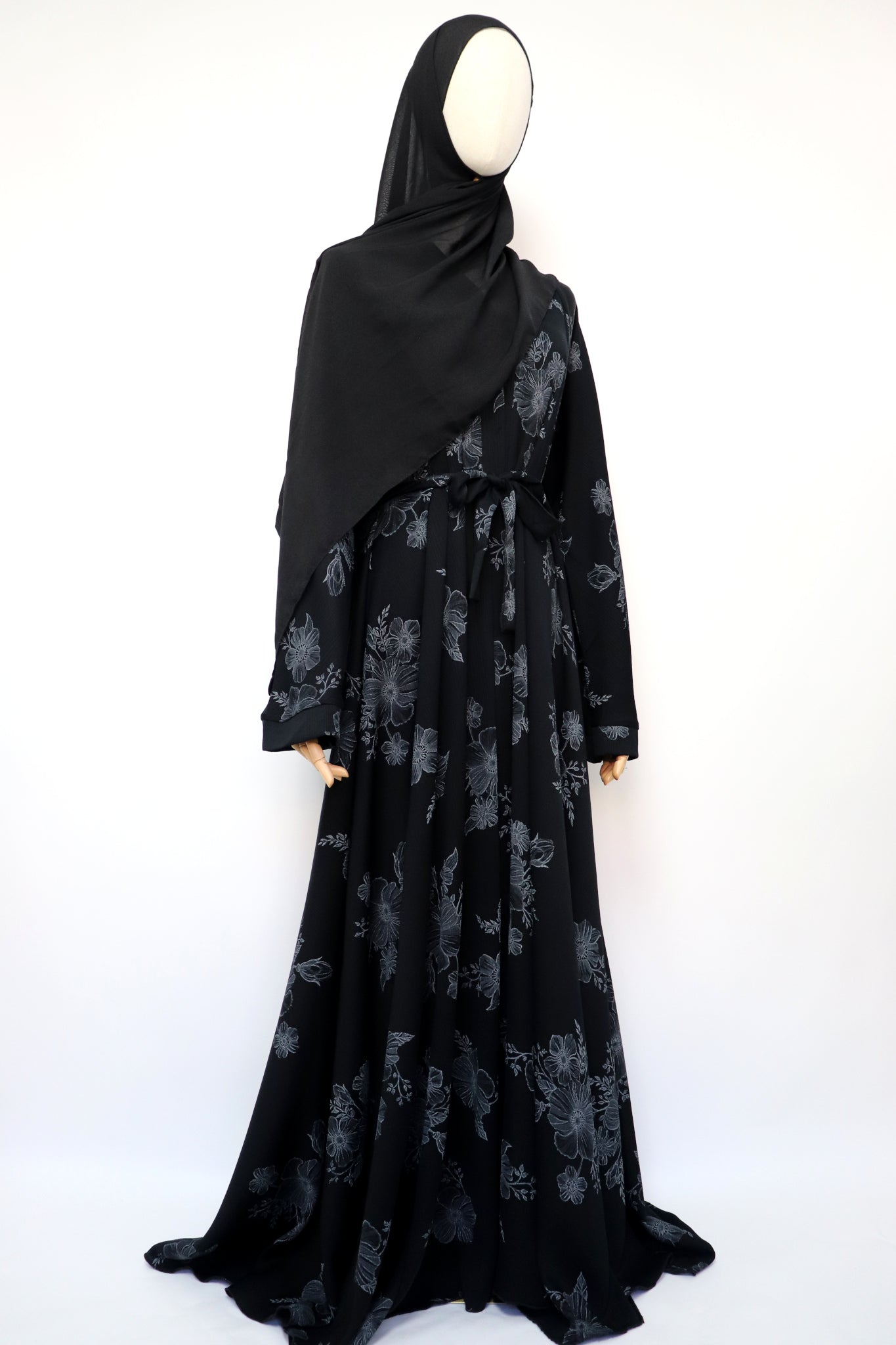 Foiled open flare umbrella abaya. Buttons closure. Comes with hijab and string belt.