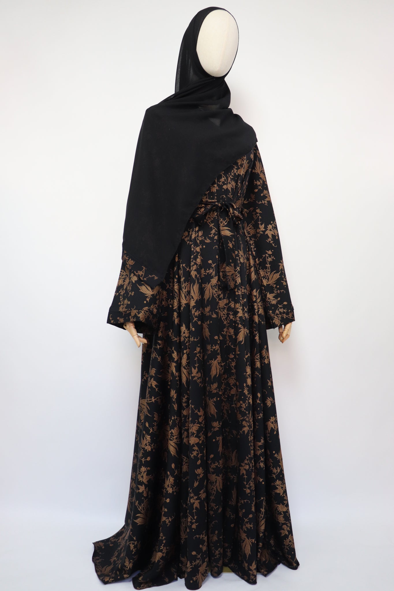 Foiled open flare umbrella abaya. Buttons closure. Comes with hijab and string belt.