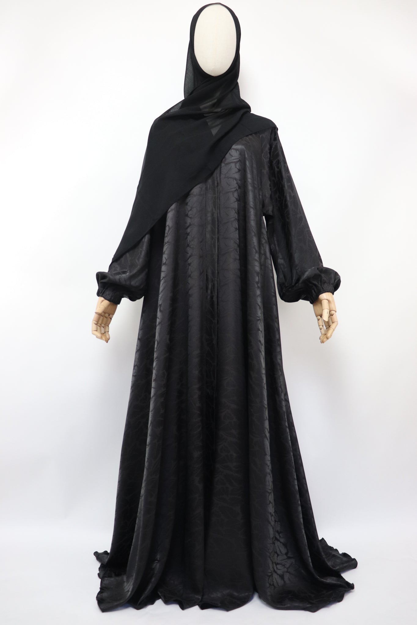 Satin jaquard open flare umbrella abaya. Elastic cuffs. Buttons closure. Comes with hijab and unattached belt.