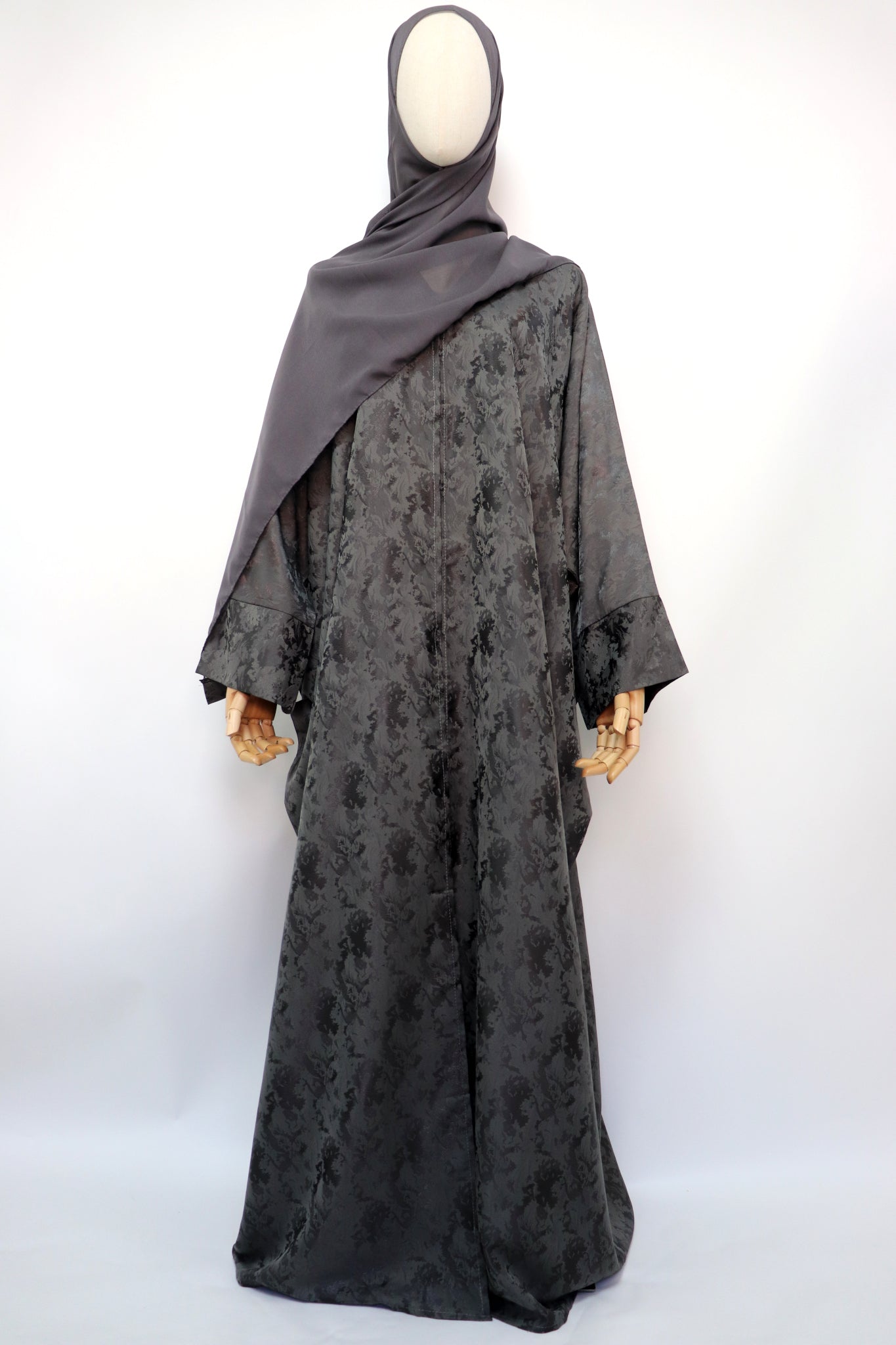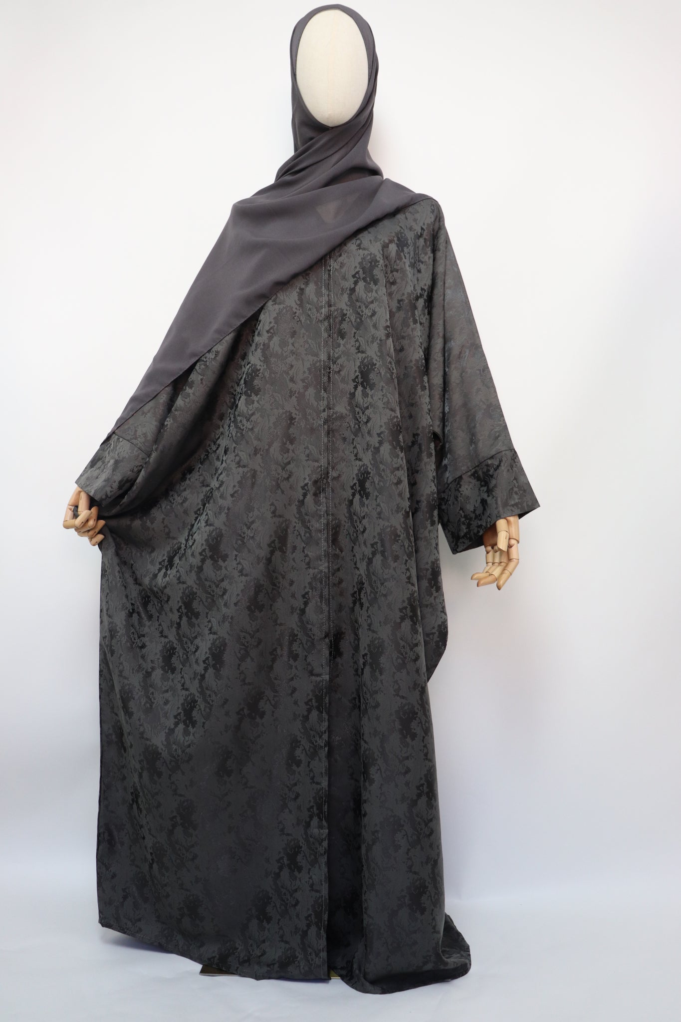 Open Bisht Batwing Satin Jacquard Abaya - Charcoal